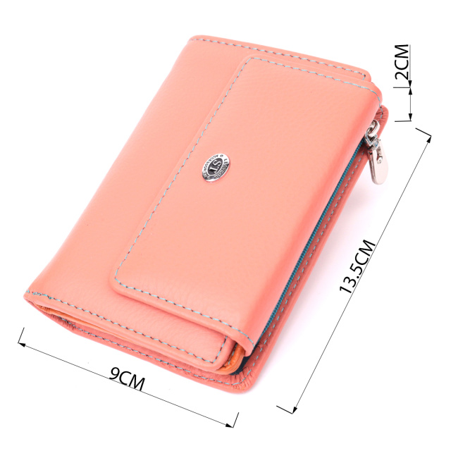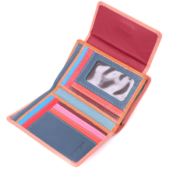 Яркий женский кошелек двойного сложения, что закрывается на клапан с магнитом. Аксессуар выполнен из качественной натуральной кожи, которая отлично носится и не теряет свой первоначальный вид с годами. Отличительная особенность этой модели в яркой внутренней расцветке. Внутри есть два отделения для купюр, девять слотов для пластиковых карт, два скрытых кармана и одна монетница, что закрывается на молнию. Идеальный аксессуар для любительниц кошельков среднего размера и практичного функционала.