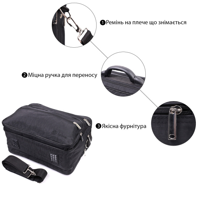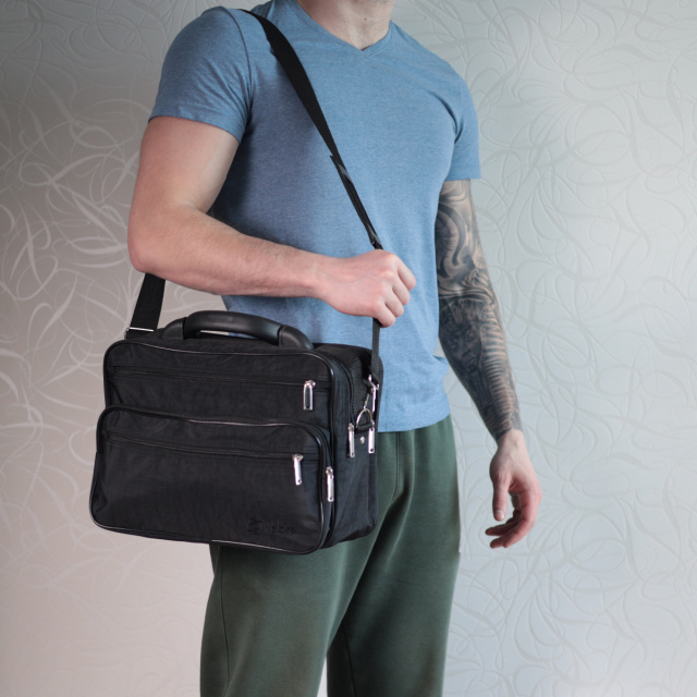 Средняя прямоугольная сумка на каждый день из качественного материала - полиэстера. Изделие имеет оптимальный размер для Вашего удобства, ее можно использовать в качестве сумки на каждый день, а также брать с собой в небольшие путешествия или командировки. Функционал сумки продуман до мелочей, она состоит из двух больших отделений и трех карманов разных размеров снаружи, что очень важно для порядка в вещах. На лицевой стороне, в правом нижнем углу, вышит значок бренда, что есть залогом качества. Носить аксессуар можно в руках, для этого предусмотрена пластиковая ручка и на плече при помощи надежного съемного регулируемого ремня. Пошита сумка аккуратно, все строчки ровные, подкладка прочная черного цвета, фурнитура надежная и качественная. Тканевая сумка станет желанным подарком для ваших близких и самое главное очень полезным и необходимым. Сумка из полиэстера, очень выгодная альтернатива кожаным сумкам, так как прослужит не меньше, не теряя свой первоначальный вид, а цена приятно порадует.