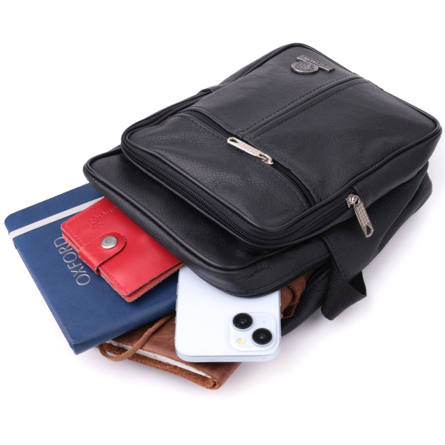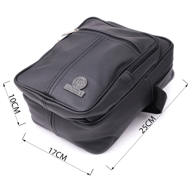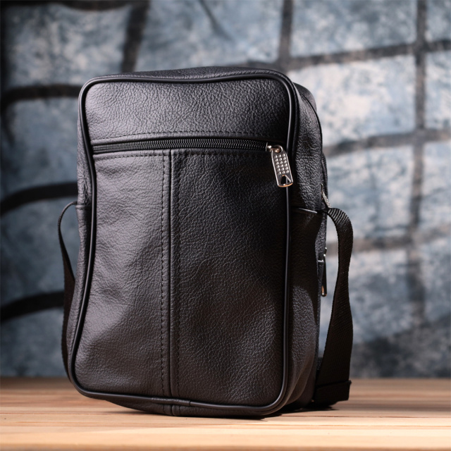 Удобная мужская сумка из натуральной кожи. Аксессуар совсем не прихотлив в уходе и пользуется особой популярностью у мужчин. Внутри сумки плотная текстильная подкладка. По краям аксессуар прошит ровной строчкой. В правом нижнем углу металлический логотип производителя. Сумка станет прекрасным подарком для любого мужчины.