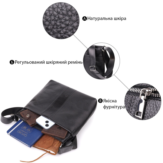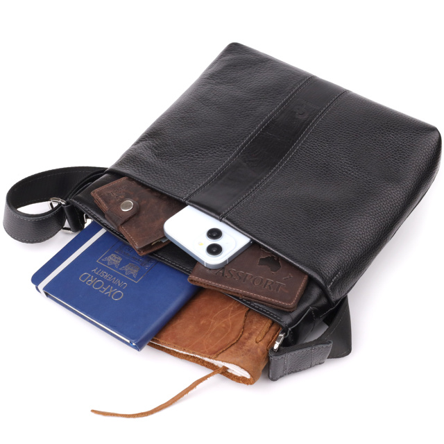 Практичная и стильная сумка-почтальонка, выполненная из натуральной кожи высокого качества. Универсальный черный цвет делает аксессуар уместным как в деловом, так и в повседневном образе. Интересная особенность модели — сочетание двух фактур кожи: гладкой и зернистой, что придаёт изделию выразительности и подчеркивает индивидуальность владельца. Сумка отличается прочностью, надёжностью и долговечностью, а благодаря продуманному дизайну в нее легко помещаются все необходимые вещи. Это отличное решение для активных и современных людей, которые ценят комфорт, качество и стиль. Поставляется в оригинальном фирменном чехле, что делает её не только удобным аксессуаром, но и достойным подарком.
