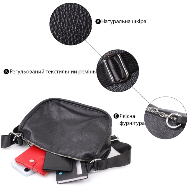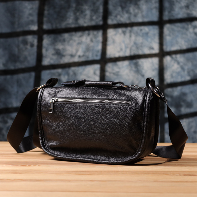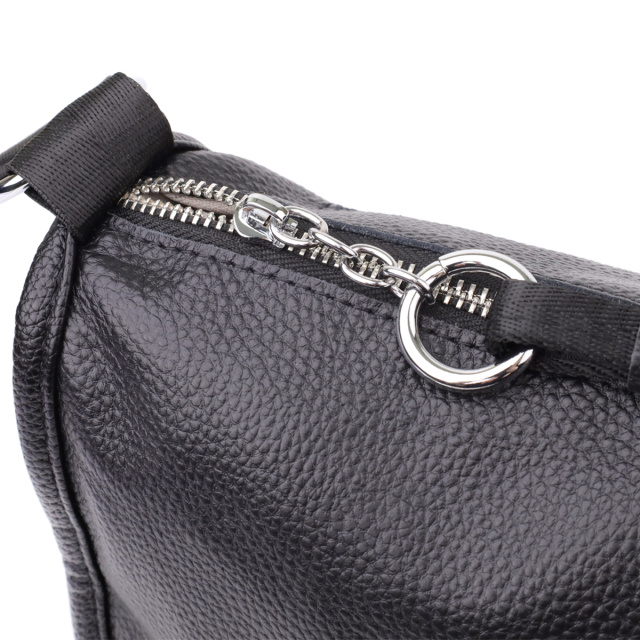 Женская кожаная сумка e в черном цвете выполнена из качественной зернистой кожи и имеет полукруглую аккуратную форму, подчеркивающую элегантность и современный стиль. Особый акцент модели — декоративный бегунок в виде стильного брелка, который добавляет индивидуальности и изысканности. Сумка закрывается на молнию, внутри одно основное отделение с двумя карманами на молнии и двумя открытыми карманами для мелочей, на тыльной стороне расположен внешний карман на молнии. Текстильный ремень не съемный и обеспечивает удобное ношение, а фурнитура под серебро гармонично дополняет общий образ. Эта сумка станет универсальным аксессуаром для повседневного использования и особых случаев, сочетая практичность, стиль и внимание к деталям.