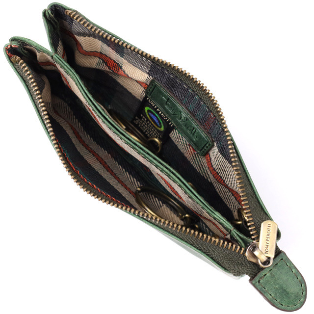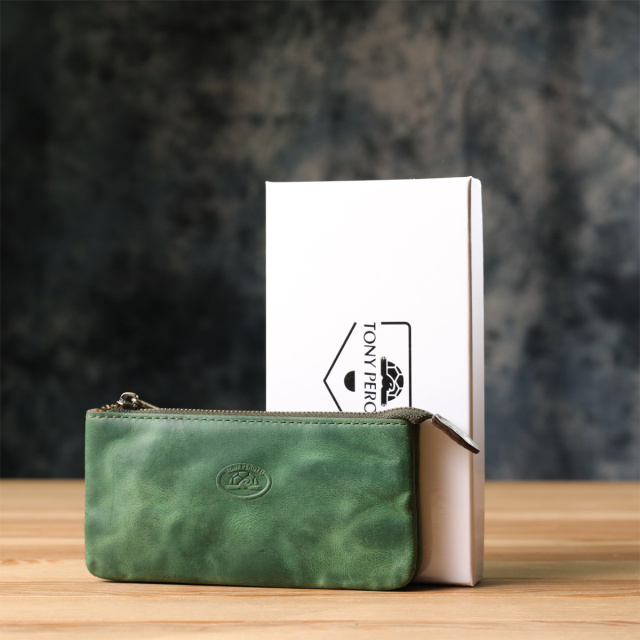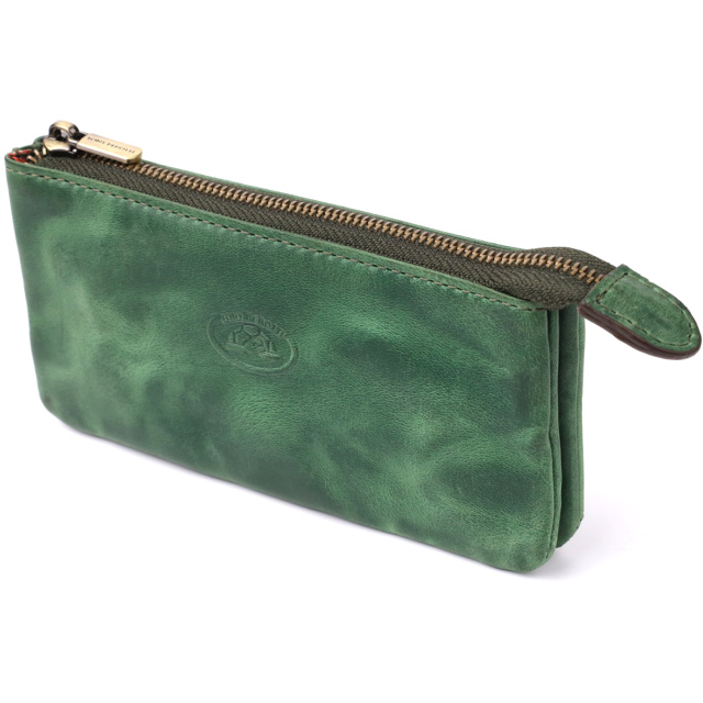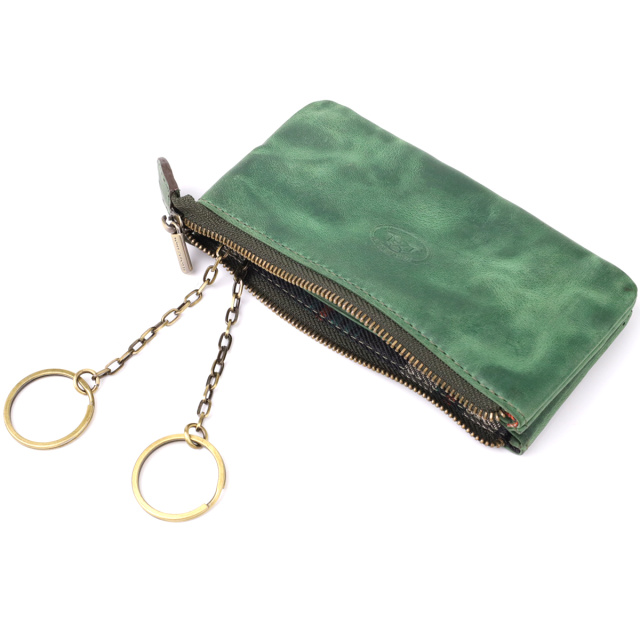Ключница из натуральной винтажной кожи в зеленом цвете. Закрывается на молнию – удобно и надежно. Оснащена тремя отделениями и двумя кольцами для ключей. Дополнена брендированной фурнитурой высокого качества. Такая ключница объединяет функциональность и элегантность. Подойдет для ежедневного использования и станет достойным аксессуаром или подарком..