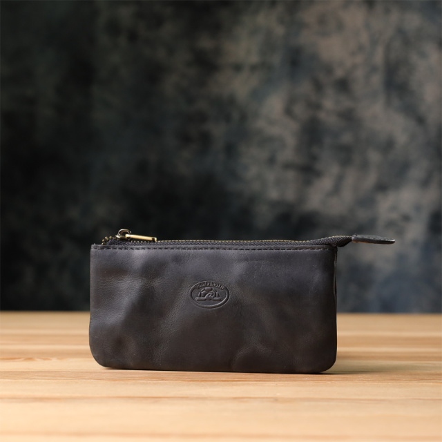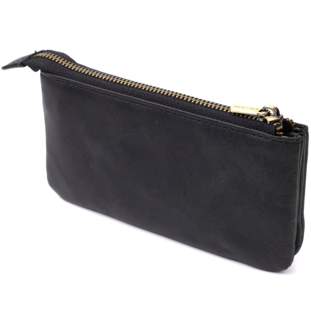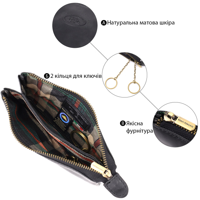 Ключница из натуральной винтажной кожи в черном цвете. Закрывается на молнию – удобно и надежно. Оснащена тремя отделениями и двумя кольцами для ключей. Дополнена брендированной фурнитурой высокого качества. Такая ключница объединяет функциональность и элегантность. Подойдет для ежедневного использования и станет достойным аксессуаром или подарком.