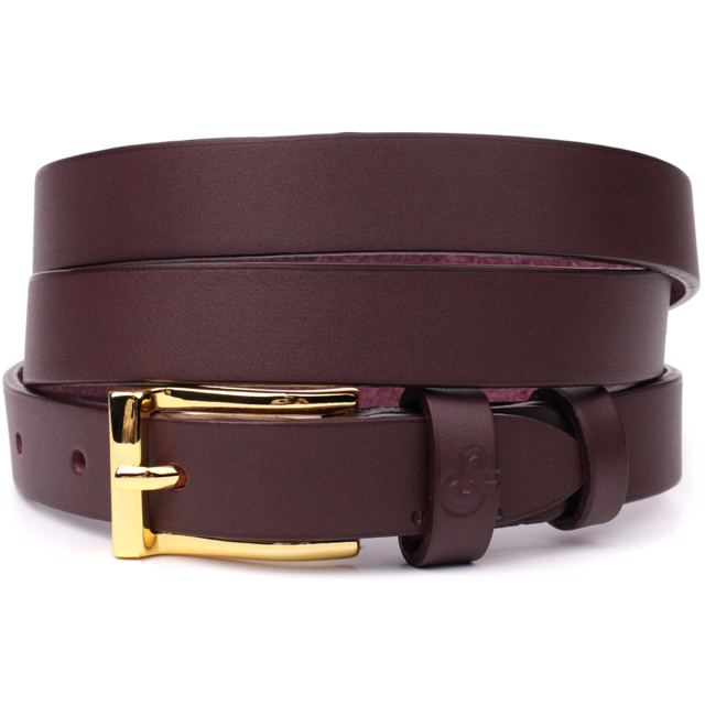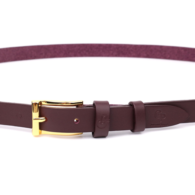 Прямоугольная пряжка цвета под жёлтое золото гармонично сочетается с насыщенным бордовым оттенком кожи, подчеркивая элегантность аксессуара. Тиснёный логотип GRANDE PELLE добавляет завершённости и служит знаком оригинальности.