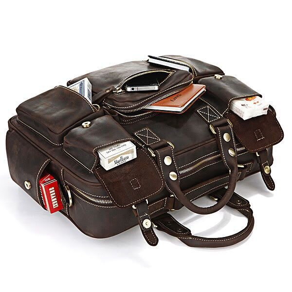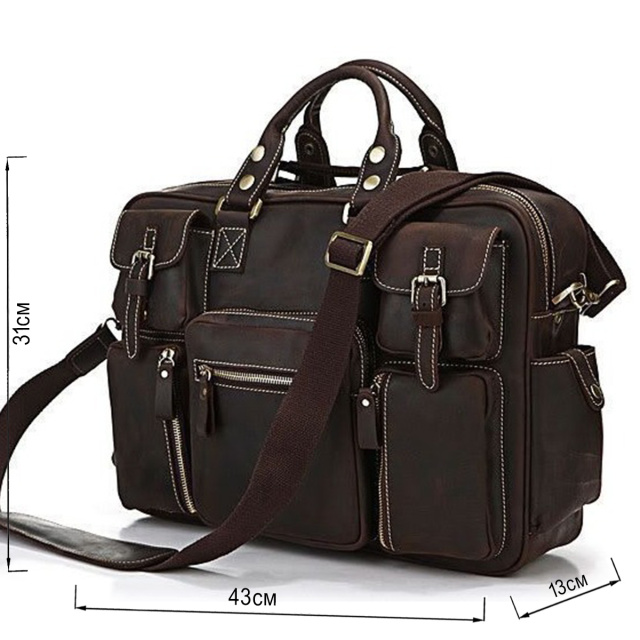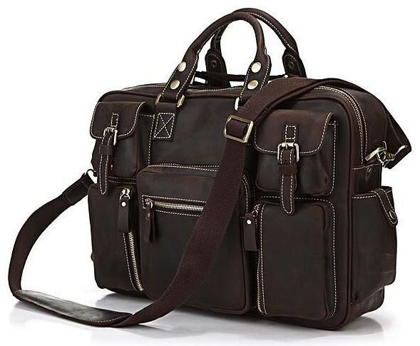 Представляем Вам отличную кожаную сумку из толстой качественной винтажной кожи. Это изделие можно отнести как к повседневным сумкам так и к кожаным дорожным сумкам(саквояжам). Сумка отлично исполнена - выглядит просто бомбезно. По функциональности тяжело придумать лучшую сумку, она имеет множество карманов и очень удобна в эксплуатации, ее можно использовать для ноутбука.