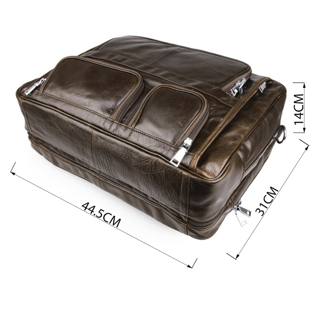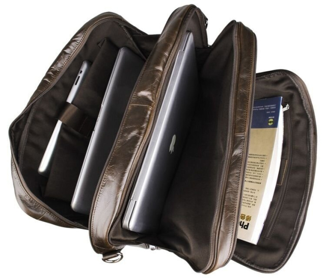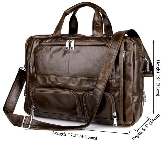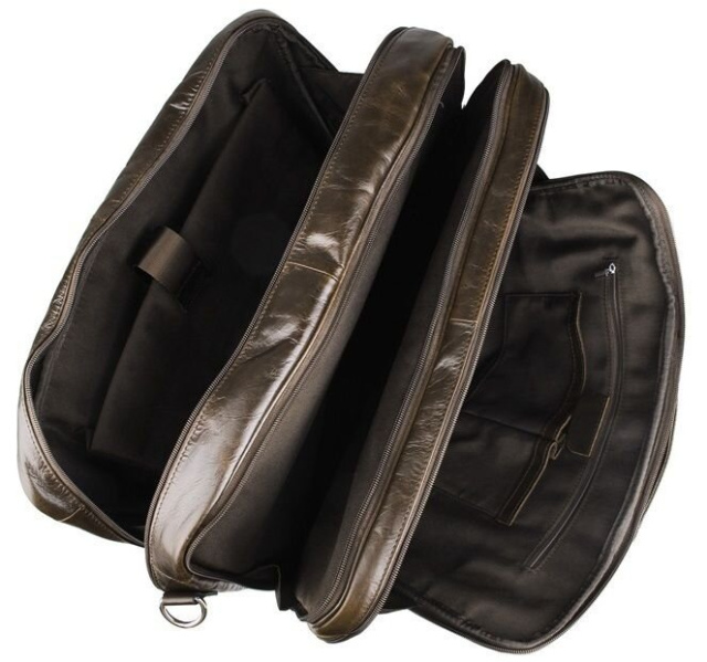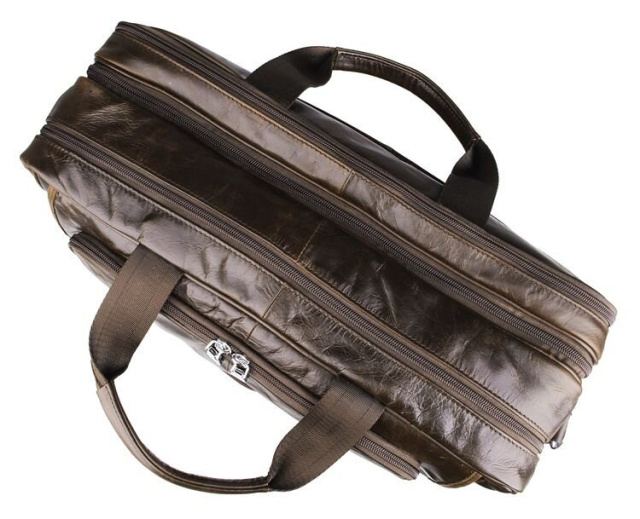 Большая мужская кожаная сумка с множеством отделений и карманов. Аксессуар можно переносить при помощи удобных ручек в руке, а также через плечо. На задней внешней стороне изделия расположена ручка с помощью, которой сумка при необходимости крепиться к чемодану. Цвет фурнитуры: серебро. Аксессуар можно использовать для носки папки с документами и ноутбука, а также как сумку для спортзала.