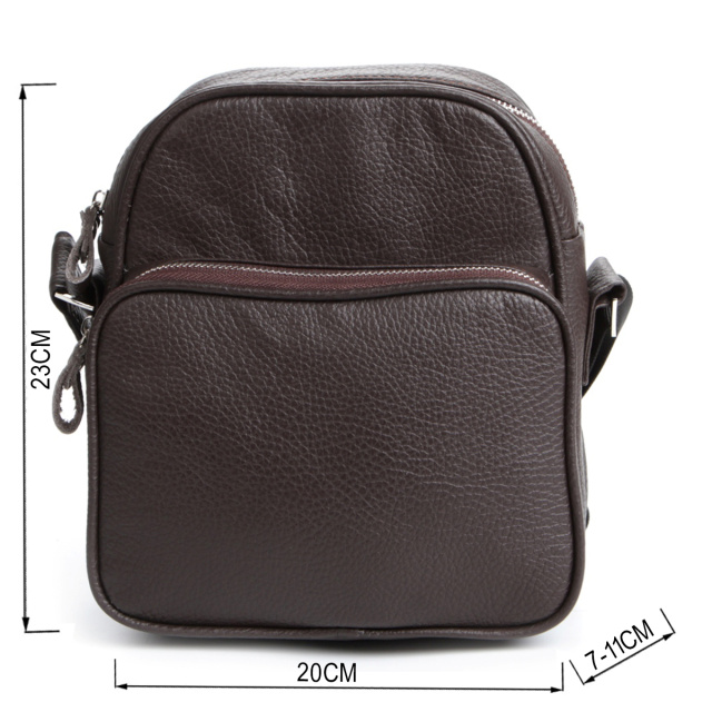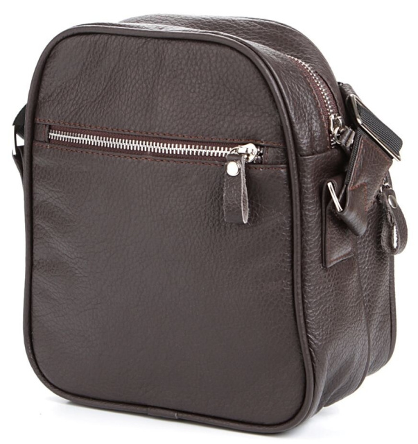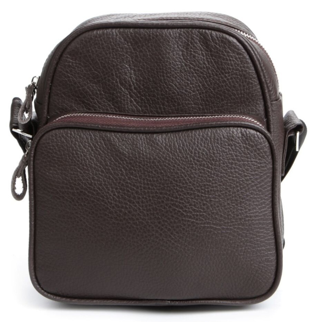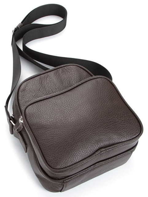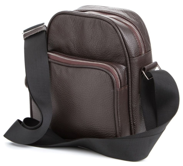 Современная мужская кожаная сумка темно-коричневого цвета. Аксессуар выполнен из кожи флотар, которая отличается «зернистой» фактурой. Цвет фурнитуры: серебро. Сумка носится через плечо при помощи регулируемого плечевого ремня, который выполнен из прочного текстильного материала.