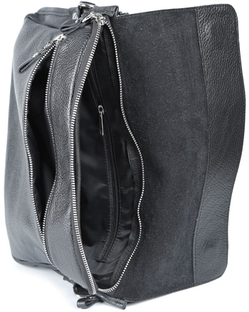 Сумочка с оригинальным дизайном, она поделена на три автономных отделения. Два отделения закрываются клапанами с магнитами, а под ними на молнию. Отделение которое находится между двумя основными, закрывается на магнитную защелку.