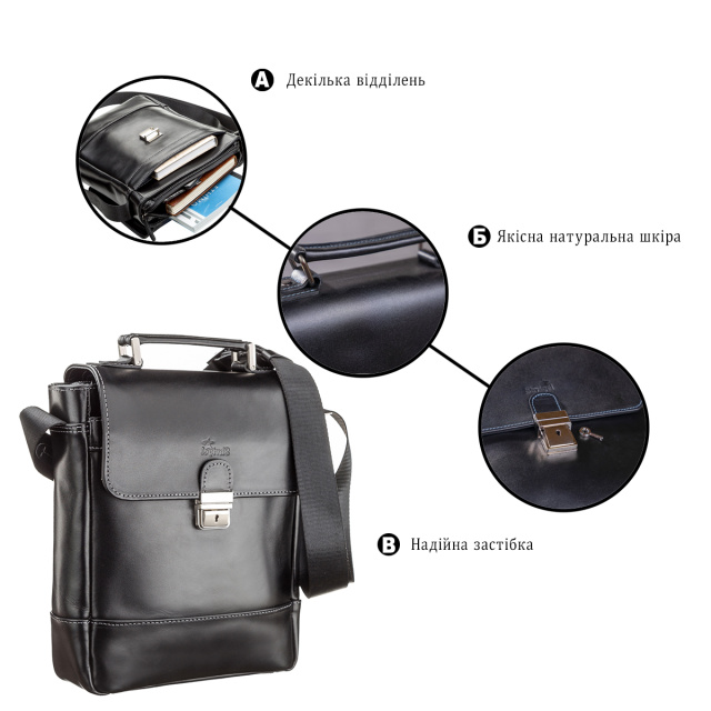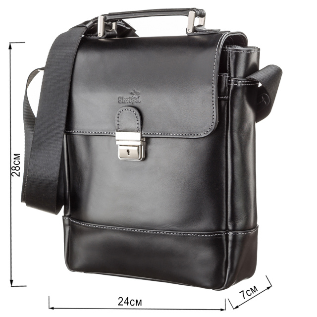 Интересная мужская сумка с ручкой и клапаном с застежкой, что закрывается на ключ. Размер очень удобный. Особенность дизайна