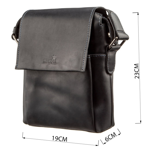 Мужская кожаная сумка небольшого размера с клапаном на закрытых магнитах. Аксессуар выполнен из натуральной винтажной кожи, характерными признаками которой, являются: неоднородность окраса и потертости, которые придают особенный внешний вид. Модель разработана специально для самых стильных мужчин. Внутри: разнообразные карманы для вашего удобства и синяя текстильная подкладка. Аксессуар прошит по краям светло-синей нитью, что добавляет модели особенного шика. Сумка упакована в тканевый чехол.