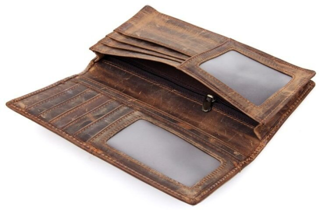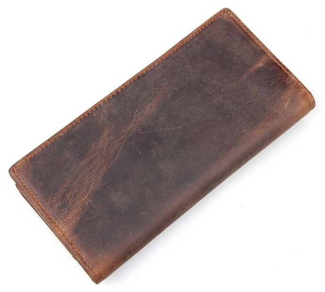 Современный мужской купюрник из натуральной высококачественной винтажной кожи. Кошелек надежно прошит сверхпрочной нитью коричневого цвета. Швы ровные, аккуратные. Аксессуар упакован в текстильный пылезащитный чехол.