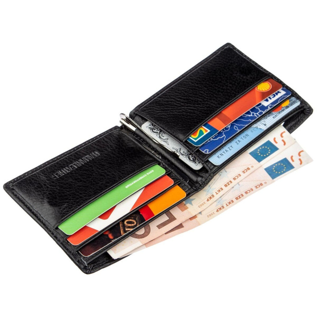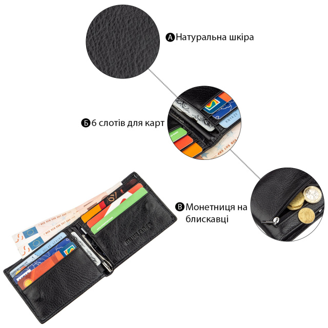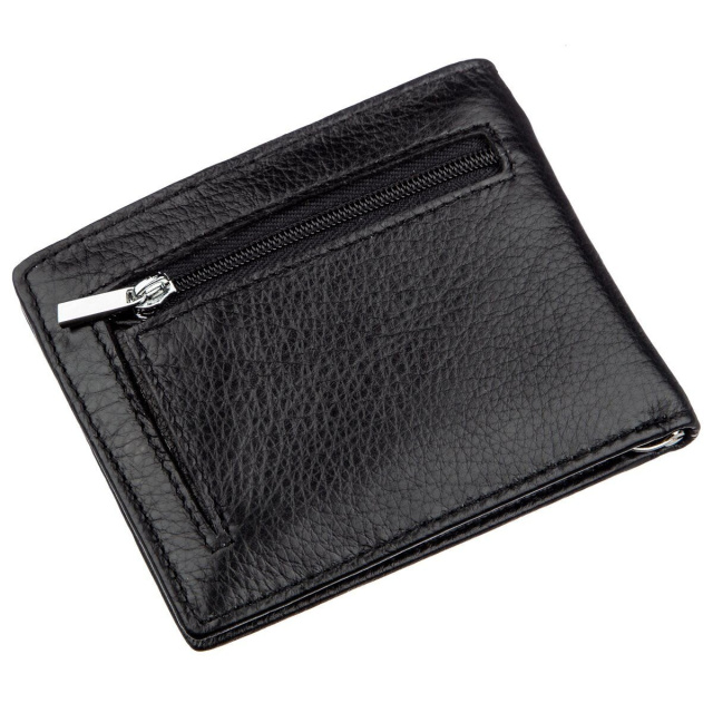Компактный, но очень практичный и функциональный мужской кошелек из высококачественной натуральной кожи черного цвета. Имеет сдержанный и не вызывающий дизайн. Прекрасно помещается в карман любого размера, также отлично влезет в небольшую мужскую сумочку, борсетку или сумку на пояс. Монетница расположена на тыльной стороне бумажника и закрывается на молнию, что очень удобно и практично. Ну и прекрасным дополнением ко всему есть зажим для купюр, что очень популярно в наши дни. Такой бумажник станет отличной покупкой для любого мужчины, ну и несомненно просто замечательным подарком. Упаковано данное изделие в плотную картонную.