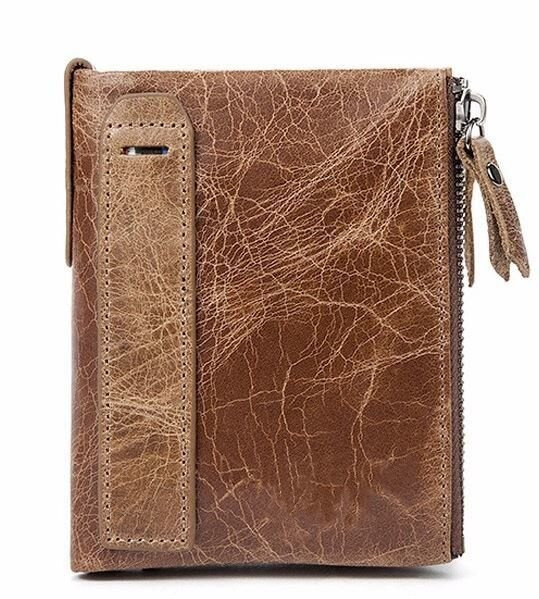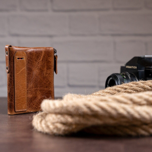 Стильный кошелек светло-коричневого цвета высокого качества. Аксессуар легко поместится в сумку. Модель имеет фантастический дизайн. В аксессуар вы легко можете поместить все необходимое на каждый день. Подойдет для тех, кто любит кошелек с минимальным удобным функционалом. По краям кошелек прошит телесной нитью. Фурнитура в кошельке цвета темного металла. Аксессуар застегивается на кнопку. Модель упакована в тканевой чехол от загрязнений, износа и пыли. Будет отличным подарком для близкого человека.