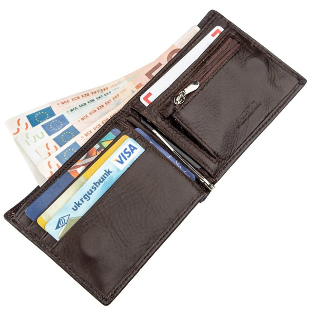 Небольшое мужское портмоне из натуральной кожи высокого качества. Выполнен в роскошном и насыщенном коричневом цвете, что придает ему особый шарм. Бумажник отличается красивым и продуманным до мелочей дизайном. В нем Вы найдет отделения для всех Ваших необходимых на каждый день ценностей, в том числе Вас порадует вместительная монетница на кнопке. Закрывается портмоне с помощью удобного и практичного магнита, который способствует быстрому доступу к содержимому кошелька. Упаковано данное портмоне в твердую белую коробку с фирменным логотипом.