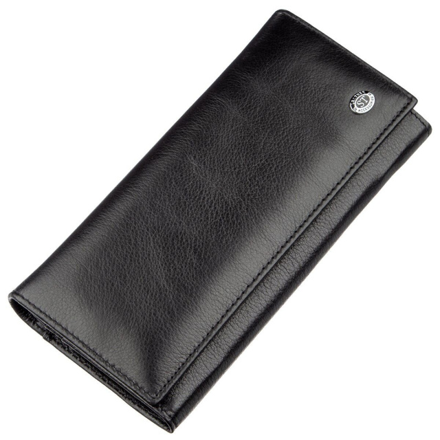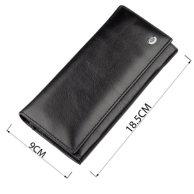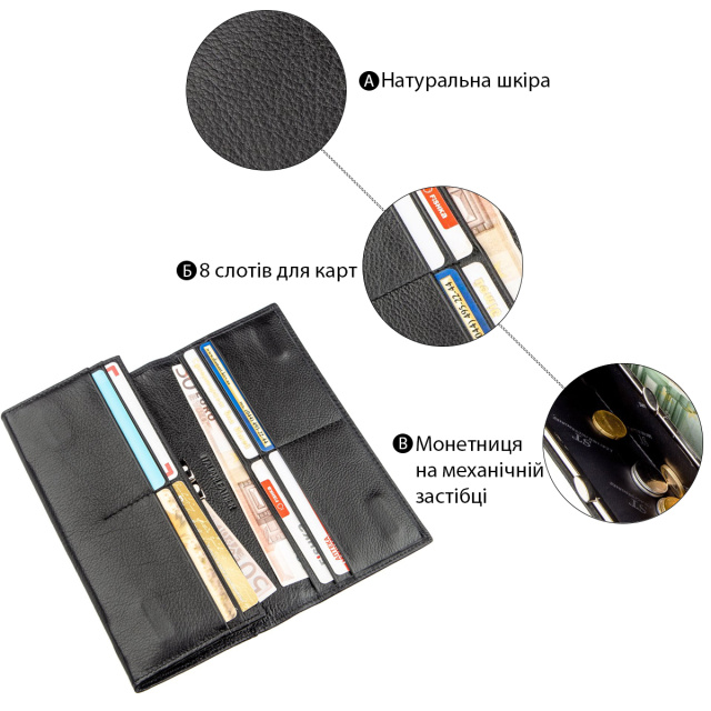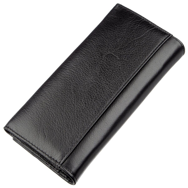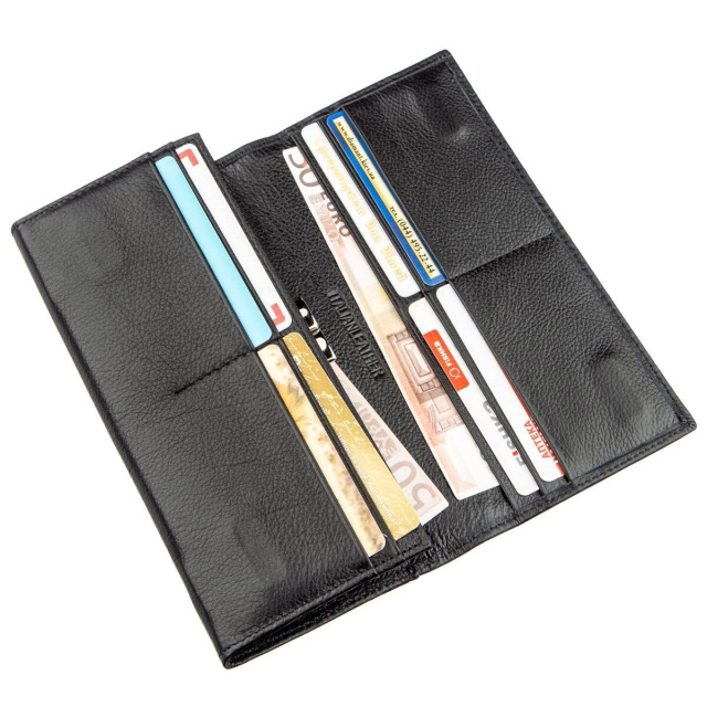 Классический кошелек для деловых и уверенных в себе женщин. Цвет – насыщенно черный. Материал исполнения – высококачественная натуральная кожа с зернистой фактурой. Смотрится очень богато и шикарно. Наполнение кошелька довольно практичное и функциональное. В нем есть различные отделения и карманы для купюр, карточек, мелочи и прочих ценностей. На внешней стороне также расположено одно потайное отделение на всю длину кошелька. Закрывается аксессуар на удобные магниты, это легко можно сделать всего в одно касание. При покупке данное изделие будет упакован в плотную картонную коробку с фирменным логотипом.