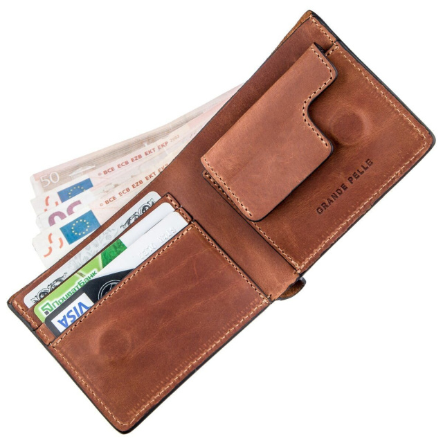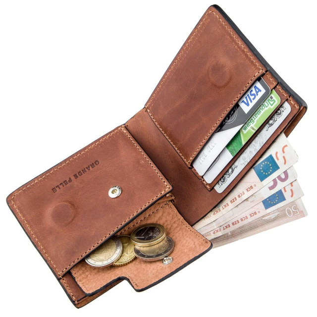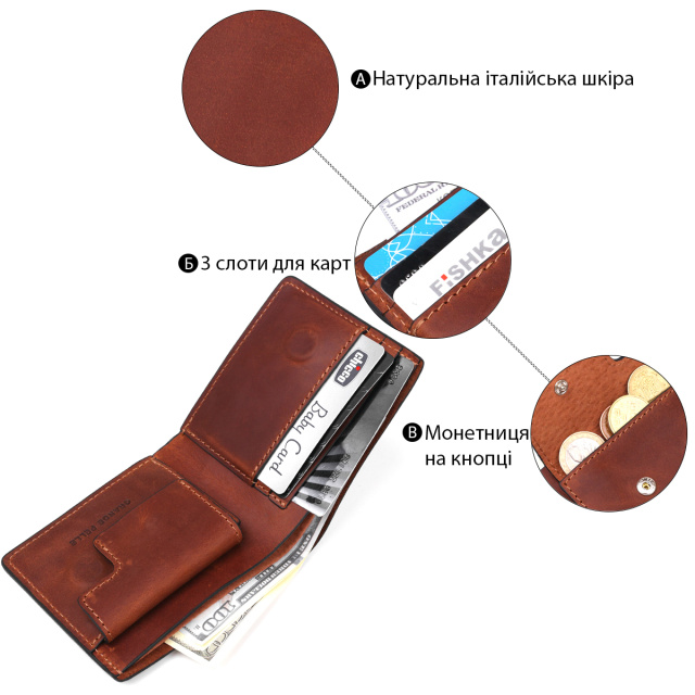 Очень компактное портмоне с самым необходимым функционалом. Особенностью данной модели является ее минимальный размер, который поместится в карман брюк или небольшую сумочку. По краям изделие прошито светлой коричневой нитью и имеет логотип внутри и на лицевой стороне изделия. Изделие также выполнено из натуральной кожи и внутри аксессуара. Вместительные отделения для купюр и фиксирующие слоты для карточек добавляют удобство вашему кошельку. В комплекте к портмоне идет фирменная картонная упаковка.