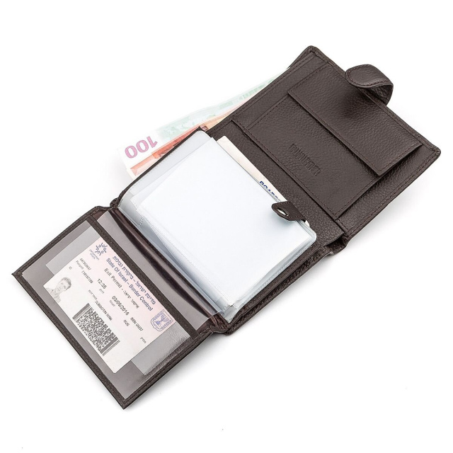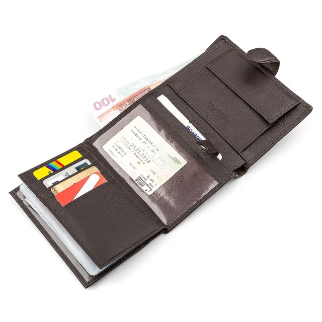 Большая моделька, которая фиксируется кнопкой. Для банкнот выделено 2 больших отделения, одно из которых можно закрыть. Для карт выделено 8 ячеек, также имеется несколько прозрачных ячеек и съемный блок для документов. Выполнен кошелек из натуральной говяжьей кожи.