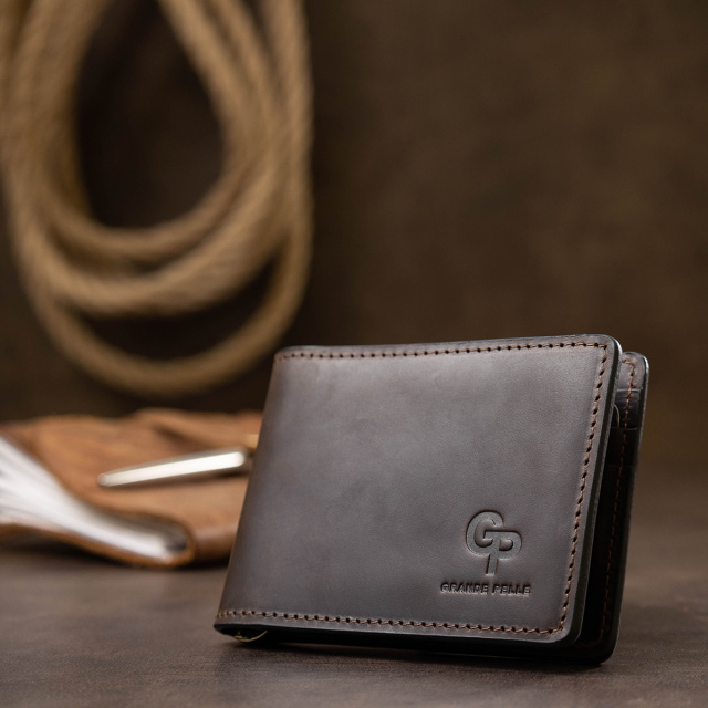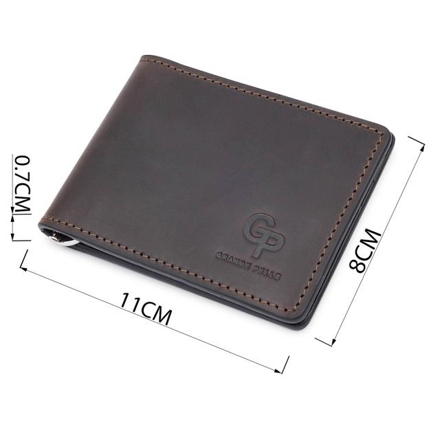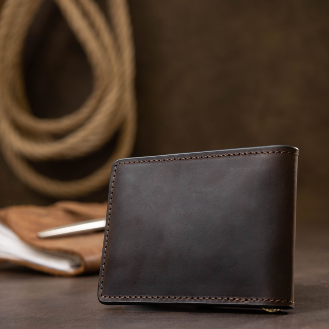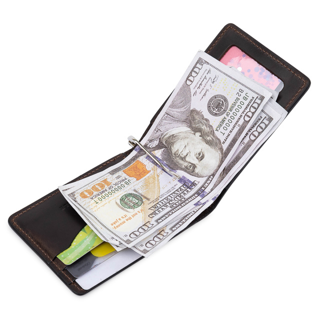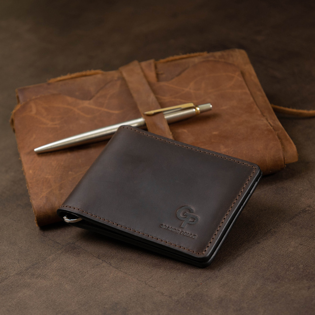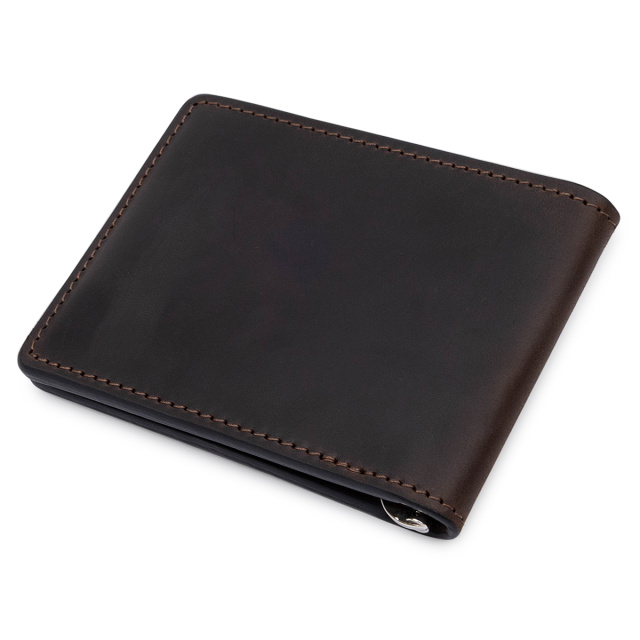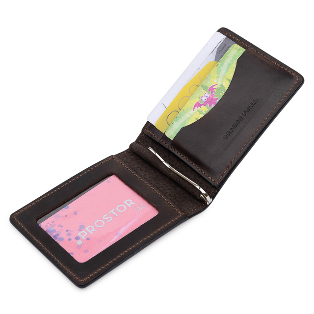 Мужской классический зажим для тех, кто не любит громоздкие кошельки. Материал изготовления – натуральная кожа с высокой устойчивостью к износу. Внутри кроме зажима, есть слоты для карточек и два кармана, один из которых – прозрачный. Упаковано изделие в фирменный плотный чехол.