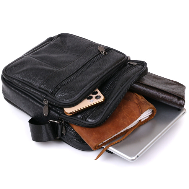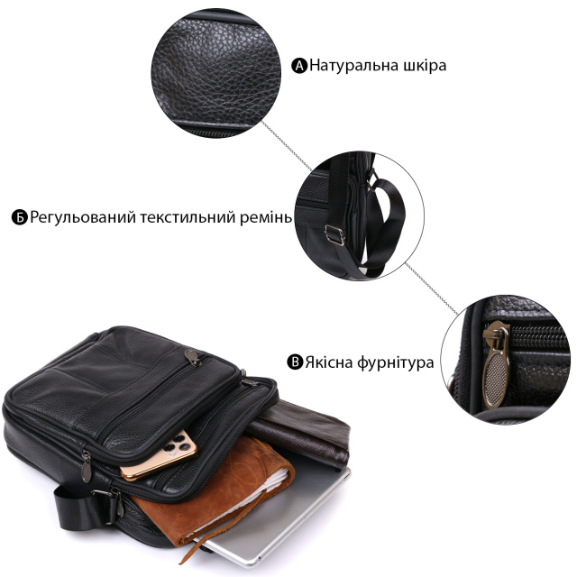Небольшой мужской мессенджер из высококачественной натуральной кожи, которая устойчива к различным повреждениям и износу. Имеет два вместительных отделения и четыре дополнительных кармана для различных аксессуаров. Ремень выполнен из прочного текстиля и регулируется по длине. Цвет изделия – универсальный черный, что очень практично и удобно.