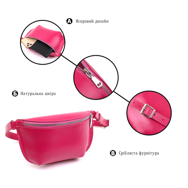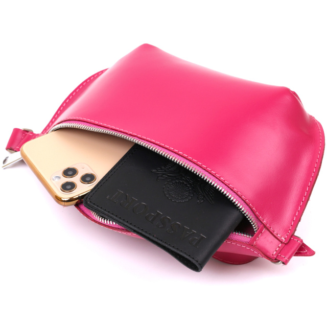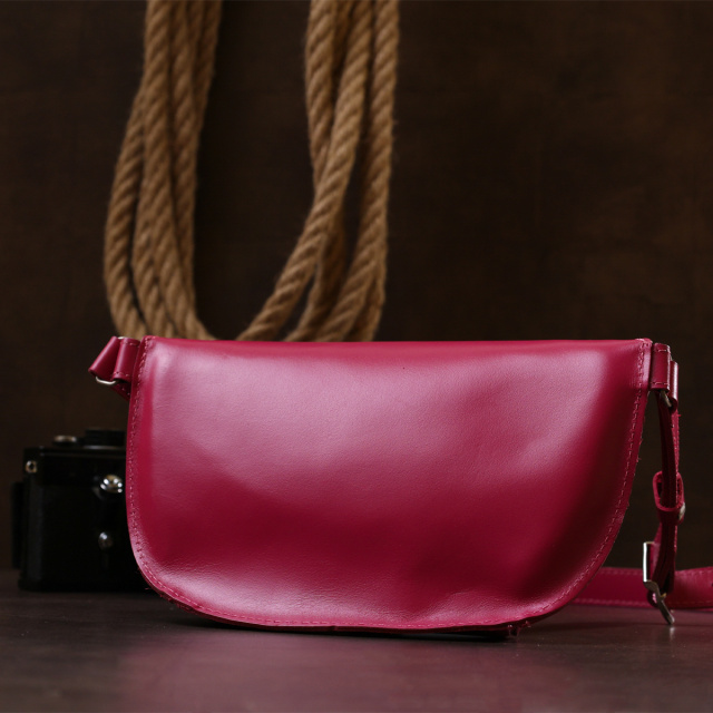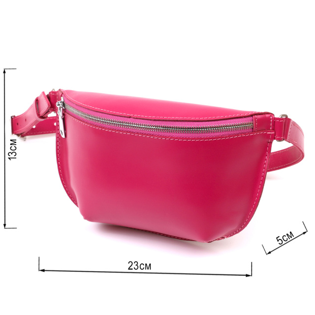 Красивая яркая женская сумка на пояс из натуральной кожи высокого качества. Имеет насыщенный малиновый цвет, который смотрится очень модно и свежо. Основное отделение закрывается на молнию, ремешок выполнен также из кожи и может регулироваться по длине. Такая сумка станет незабываемым подарком на любой праздник.