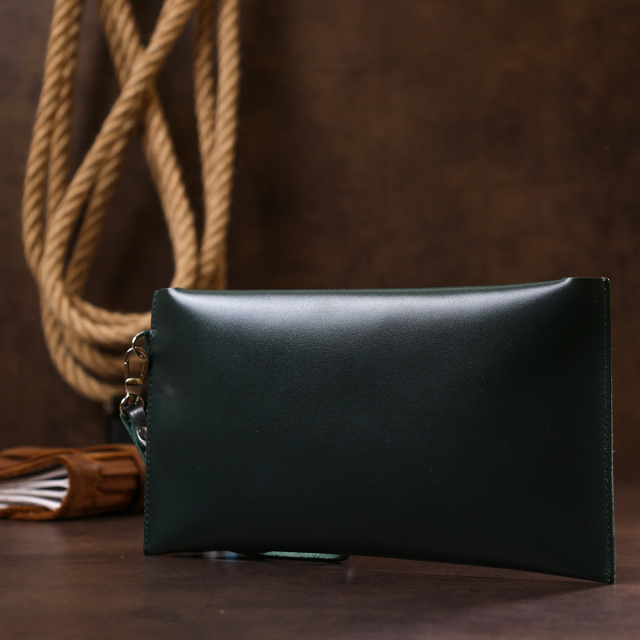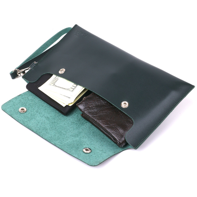 Превосходная тревел-косметичка для хранения важных и ценных вещей, чаще всего аксессуары такого рода используют во время путешествий. Материал изготовления – натуральная кожа высокого качества с повышенной устойчивостью к износу. Косметичка имеет съемный кожаный ремешок на запястье, что очень удобно и практично. Цвет изделия – темно-зеленый, фактура – гладкая.