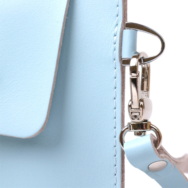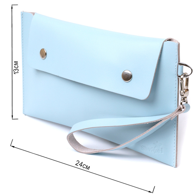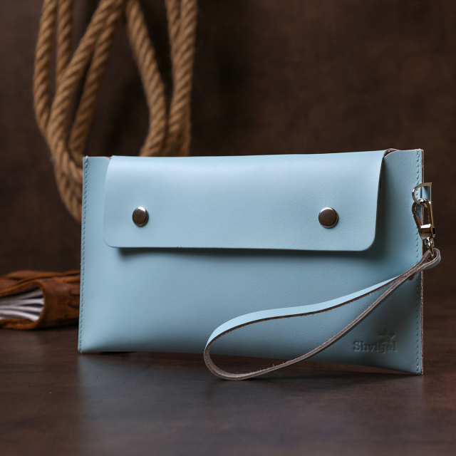 Интересная женская косметичка для путешествий или повседневного использования. Материал изготовления – натуральная высококлассная кожа в гладкой и приятной на ощупь фактуре. Закрывается изделие на клапан с двумя кнопками, также есть ремешок съёмный на запястье. Цвет данной модели – нежно голубой, что смотрится очень красиво. Такая косметичка, несомненно, станет вашим любимым аксессуаром.