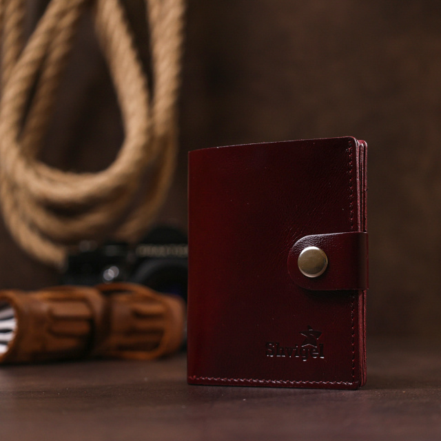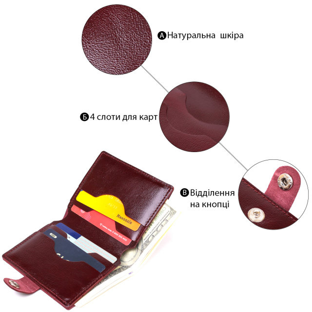 Классическое портмоне в строгом дизайне от украинского производителя. Выполнено из натуральной высококлассной кожи с отменными показателями износостойкости и прочности. Внутри есть вместительное отделение для купюр на всю длину и несколько карманов для пластиковых карточек. Закрывается аксессуар с помощью кожаного хлястика на кнопку.