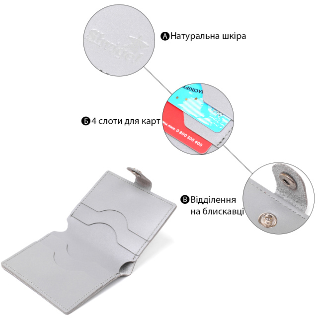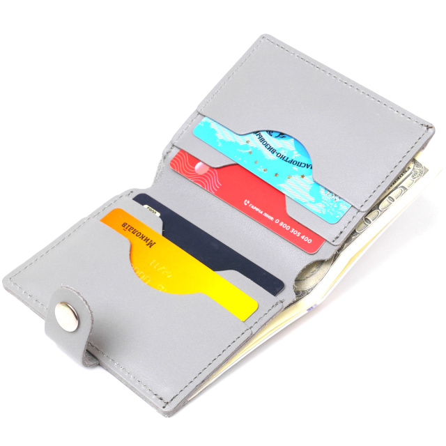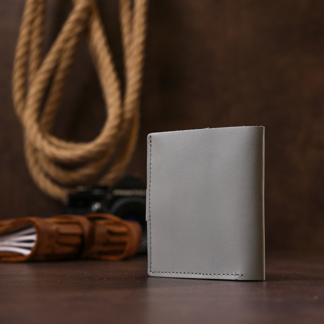 Модное и современное портмоне в два сложения в трендовом сером цвете. Материал изготовления – натуральная кожа высокого класса с улучшенными эксплуатационными характеристиками. Внутри можно разместить купюры и пластиковые карточки. Фактура аксессуара – гладкая и очень приятная на ощупь. Закрывается кошелек на хлястик с кнопкой.