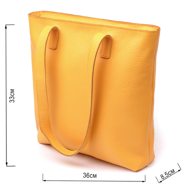 Красивая женская сумка для шоппинга в стильном и лаконичном дизайне от украинского производителя. Выполнена данная модель из натуральной высококлассной кожи с отменными характеристиками. Внутри есть одно большое и вместительное отделение с потайным карманом, на внешней стороне – карман на молнии. Фактура сумки – зернистая, цвет – сочный желтый.