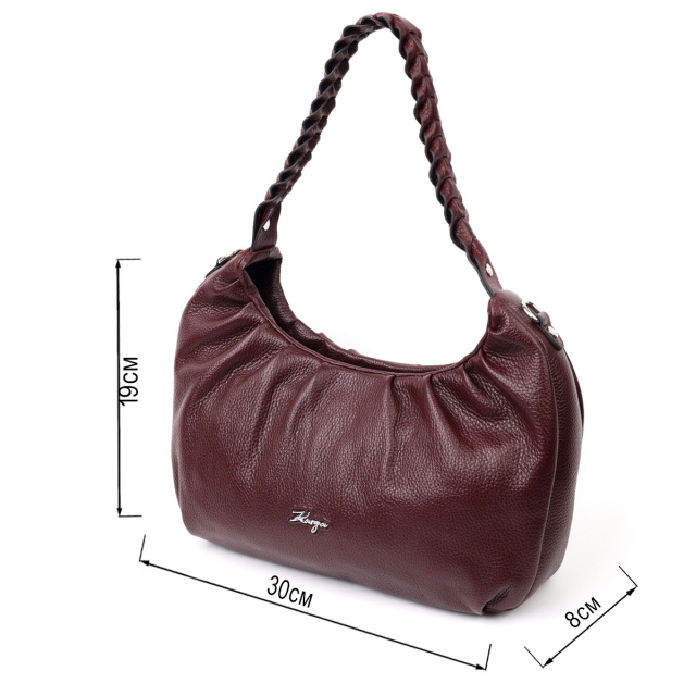 Отличная сумка-багет среднего размера из натуральной крупнозернистой кожи, в красивом бордовом цвете. Изделие имеет надежную плетенную ручку для переноса в руке, а также кожаный съемный и регулируемый по длине, плечевой ремень. Сумка функциональна и удобна в эксплуатации, изделие имеет качественную фурнитуру серебристого цвета и прочную подкладку. Аксессуар упакован в фирменный текстильный мешок Karya. Сумка из натуральной кожи всегда будет отличным подарком любой женщине.