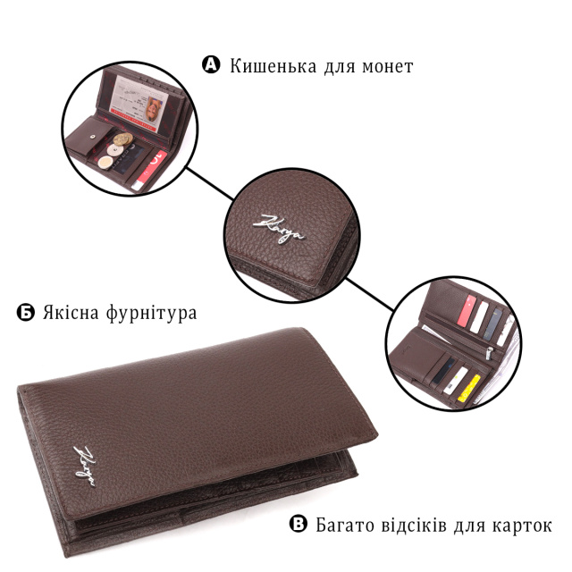 Вместительный мужской кошелек из натуральной мягкой кожи, в коричневом цвете. Удобное портмоне из натуральной кожи без застежки. Изделие имеет два глубоких кармана для купюр (один на молнии). Внутри достаточно ячеек для кредиток. Аксессуар упакован в фирменную коробочку. Изделия из натуральной кожи всегда будут отличным подарком для близкого человека.