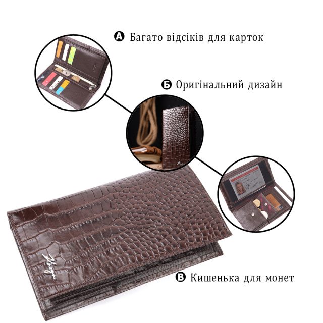 Практичный мужской кошелек из натуральной фактурной кожи, с тиснением под крокодила. Удобное портмоне из натуральной кожи без застежки. Изделие имеет два глубоких кармана для купюр ( один на молнии). Внутри достаточно ячеек для кредиток. Аксессуар упакован в фирменную коробочку. Изделия из натуральной кожи всегда будут отличным подарком для близкого человека.