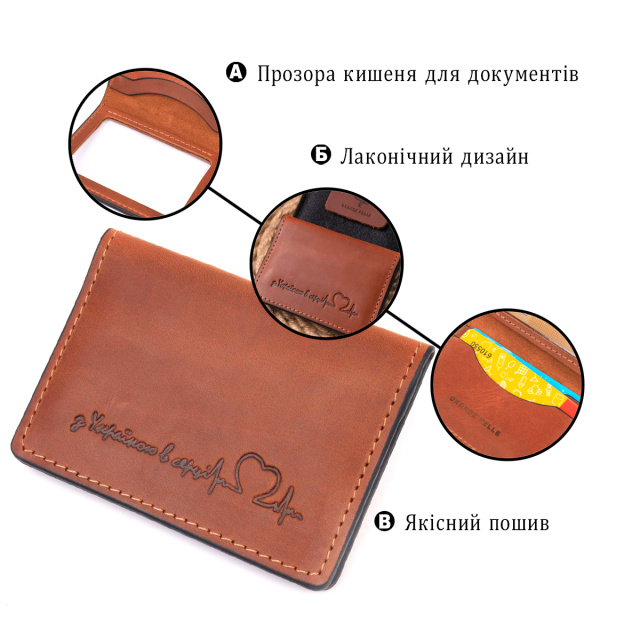 Стильная кожаная обложка на авто документы, для настоящего патриота с надписью “ З Україною в серці” на лицевой стороне. Изделие пошито с итальянской качественной кожи. По краям модель прошита коричневой строчкой в дизайн изделия. Изделие небольшого размера и с легкостью поместится в карман или маленькую сумку. В комплекте к изделию идет фирменный фетровый чехол.
