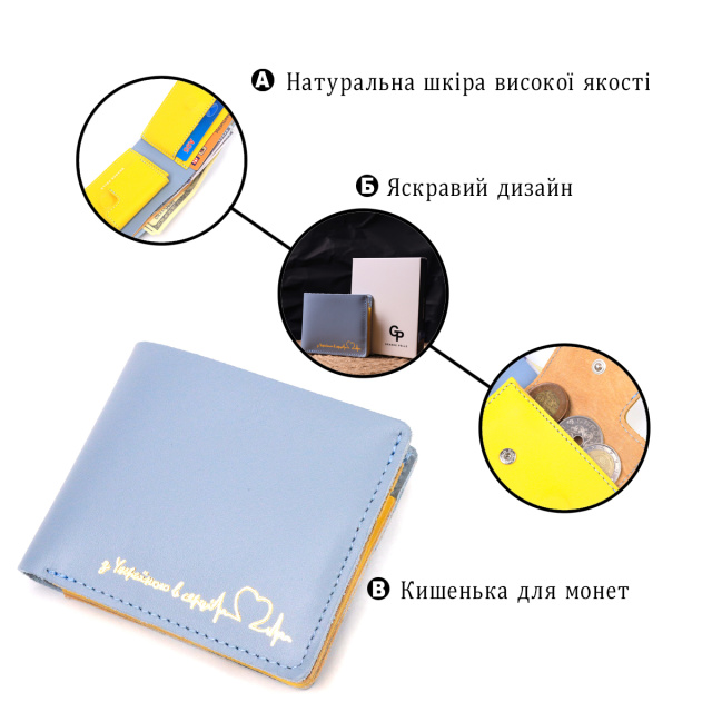 Стильный кожанный кошелек, в комбинации двух цветов голубого снаружи и желтого внутри c патриотической надписью “З Україною в сердці”. Изделие пошито из качественной гладкой кожи, с високими показателями износостойкости . Портмоне имеет два больших отделение для купюр всех номиналов, а также достаточное количество отделений для карт и монетницу, застегивается изделие на надежный магнит. Кожаный кошелек станет отличным подарков на все случаи жизни.