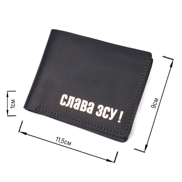 Превосходный кожаный кошелек черного цвета , c патриотической надписью “Слава ЗСУ”. Изделие пошито из качественной винтажной кожи, с високими показателями износостойкости . Портмоне имеет одно большое отделение для купюр всех номиналов, а также достаточное количество отделений для карт, без застежки. Кожаный кошелек станет отличным подарком на все случаи жизни.