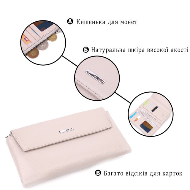 Функциональный кожанный кошелек , в красивом бежевом цвете. Изделие пошито из качественной кожи, с високими показателями износостойкости. Портмоне имеет четыре больших отделения для купюр всех номиналов, а также тринадцать отделений для карт, два кармана на молниях и закрывается клапаном на магниты. Кожаный кошелек станет отличным подарком на все случаи жизни.