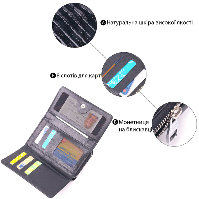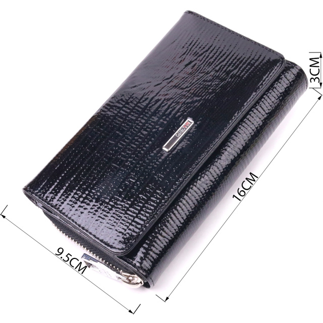 Стильное женское лакированное портмоне в современном дизайне и классическом черном цвете. Изделие выполнено из натуральной кожи высокого качества. Портмоне имеет глубокое отделение для купюр, восемь ячеек для пластиковых карточек, два прилегающих кармана, два отделения под сеточкой и монетницу на молнии снаружи. Закрывается аксессуар на кнопку. Данный аксессуар прекрасно подойдет в качестве подарка и принесет любой женщине исключительную радость.