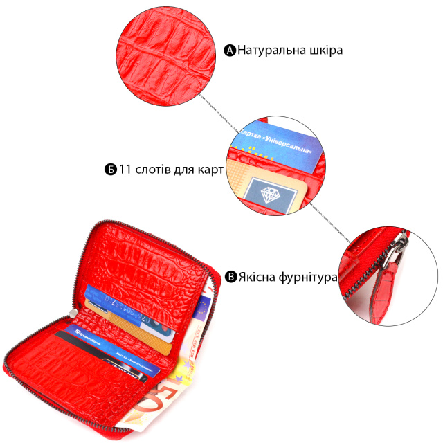 Яркий женский кошелек, из натуральной фактурной кожи, с тиснением под крокодила. Аксессуар имеет одно основное отделение, в которое помещаются купюры всех номиналов, одиннадцать карманов для карточек, один из которых под сеточкой, блок для карт с внешней стороны, а также карман для пропуска, под сеточкой с лицевой стороны. Закрывается аксессуар на молнию, а блок для карт хлястиком на кнопку. Цвет фурнитуры – темное серебро. Кожаный кошелек является удивительным подарком для жены, девушки, подруги.