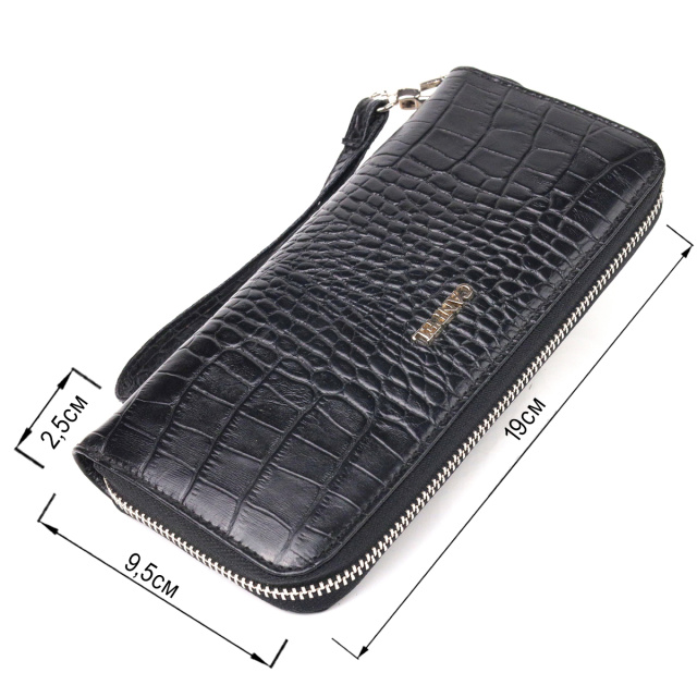 Стильный женский кошелек, из натуральной фактурной кожи, в классическом черном цвете. Аксессуар имеет три основных отделения, в которые помещаются купюры всех номиналов, две перегородки, одна из них на молнии, восемь карманов для карточек, два прилегающих кармана и съемный кистевой ремень. Закрывается аксессуар на молнию. Отличный аксессуар, надежного производителя, который прослужит очень долго.