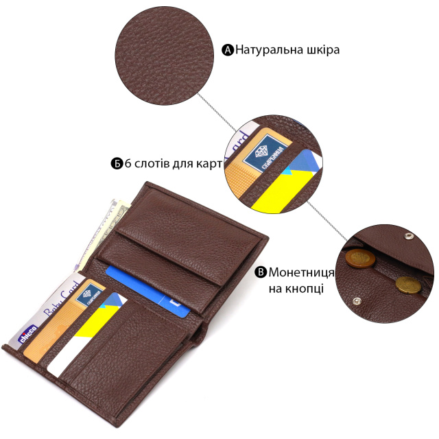 Стильный и красивый мужской кошелек в коричневом цвете, из натуральной кожи. Аксессуар имеет одно основное отделение с перегородкой, в которое помещаются купюры всех номиналов, шесть карманов для карточек, два кармана под сеточкой для документов, монетницу и один прилегающий карман. Закрывается аксессуар пополам без застежки. Упакован бумажник картонную коробку. Кожаный кошелек является отменным подарком для родных и близких людей.
