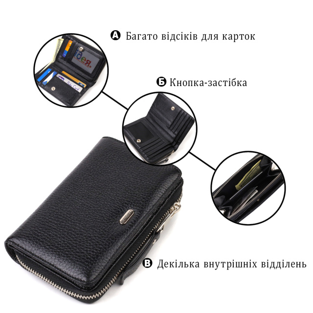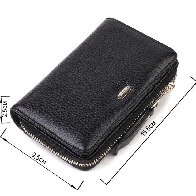 Практичный женский кошелек из натуральной зернистой кожи. Аксессуар имеет два отделения для купюр, восемь ячеек для карточек (одна под сеточкой), четыре прилегающих кармана и монетницу. Закрывается аксессуар в два сложения на кнопку. Приобретая кожаный аксессуар этой фирмы себе или на подарок, будьте уверены, что он будет радовать глаз не один год.
