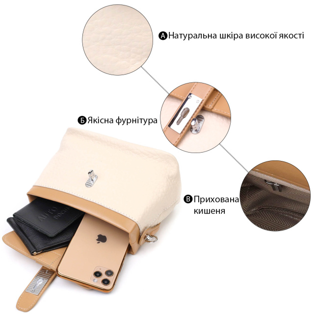 Каркасная женская сумка из натуральной фактурной кожи высокого качества в красивом молочном цвете. . Модель дополнена фурнитурой цвета серебра . Аксессуар имеет одно основное отделение в котором карман на молнии. Закрывается модель клапаном на механическую защелку. Идеальный вариант для любой девушки, на любой сезон.