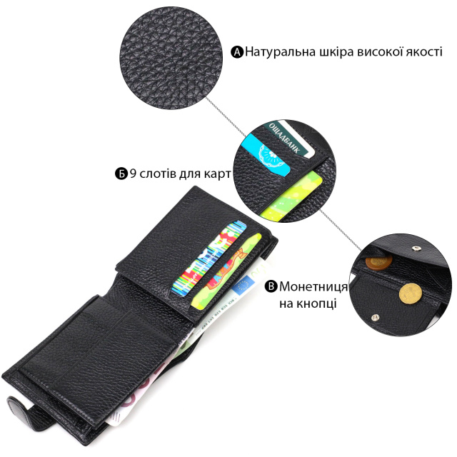 Функциональный бумажник для купюр выполнен из добротной натуральной кожи черного цвета. В данный аксессуар отлично помещаются купюры всех номиналов. Изделие состоит из двух отделений для купюр, девяти ячеек для кредиток, одного скрытого кармана, монетницы и двух отделений под сеткой под документы. Закрывается кошелек кожаным хлястиком на кнопку. Изделия из натуральной кожи всегда будут отличным подарком для близкого человека.