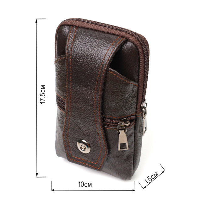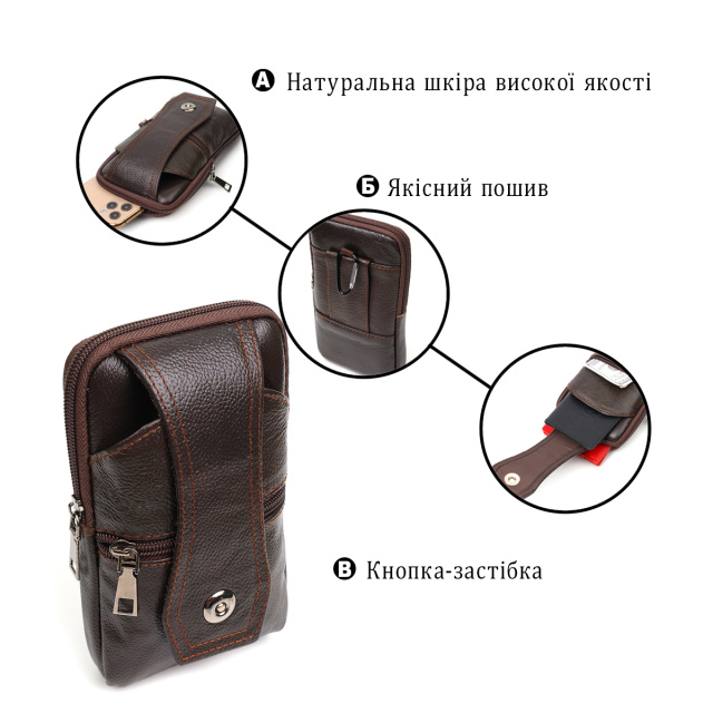 Практичная сумка из натуральной мягкой кожи. Модель имеет очень удобный функционал - основное отделение на молнии, накладной карман под хлястиком на магнитной кнопке и встроенный карман на молнии на лицевой стороне. Носить можно на поясе с помощью петельки или подцепив ее при помощи карабина. Изделие имеет компактный размер и подойдет вместо клатча для самых необходимых вещей. Идеальный вариант для ценных вещей в дорогу или путешествие.