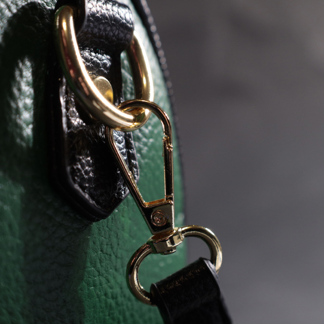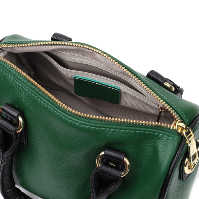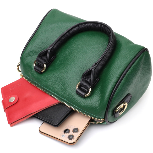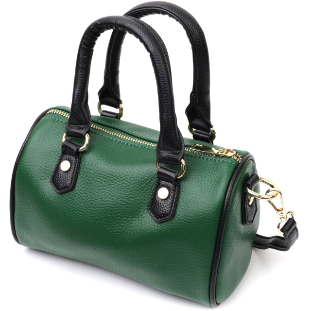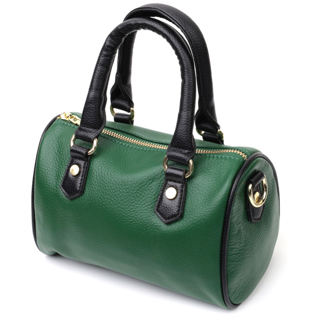 Интересная женская сумка-боченок из натуральной кожи. Изделие представлено в сочетании двух цветов зеленого и черного.Аксессуар состоит из одного отделения в котором потайной карман на молнии. Носить сумку можно в руке, для этого предусмотрены кожаные ручки, а также на плече и через плечо, для этого имеется кожаный съемный ремень. В аксессуаре использована качественная фурнитура цвета желтого золота. Отличный вариант сумки для женщин, которые любят качественные и стильные вещи.