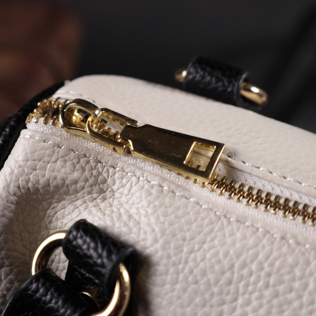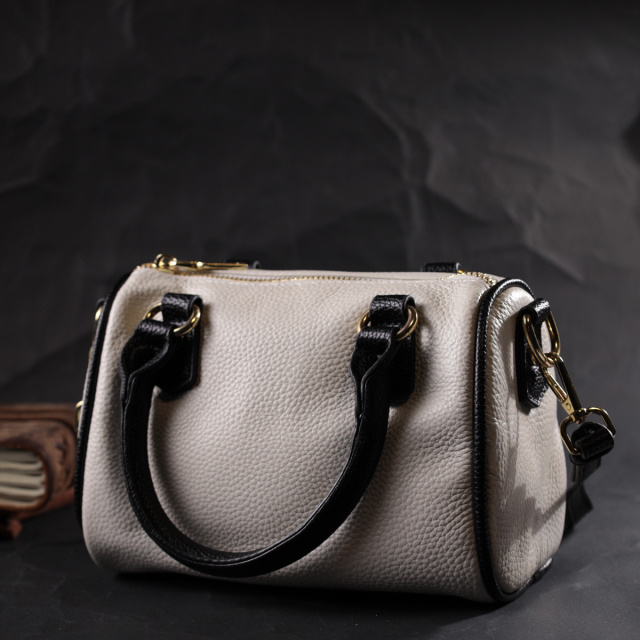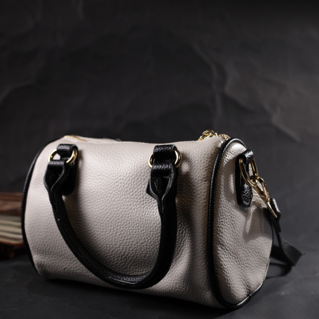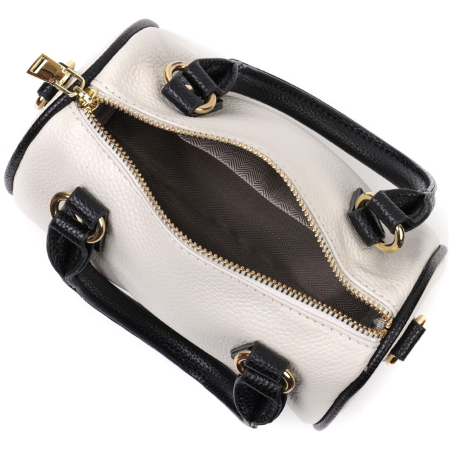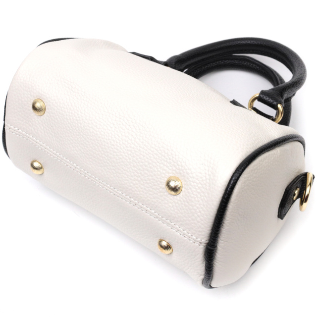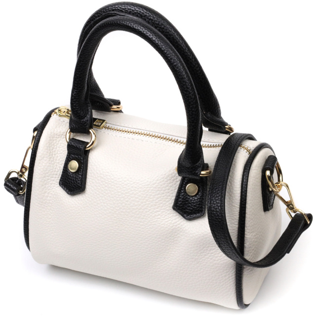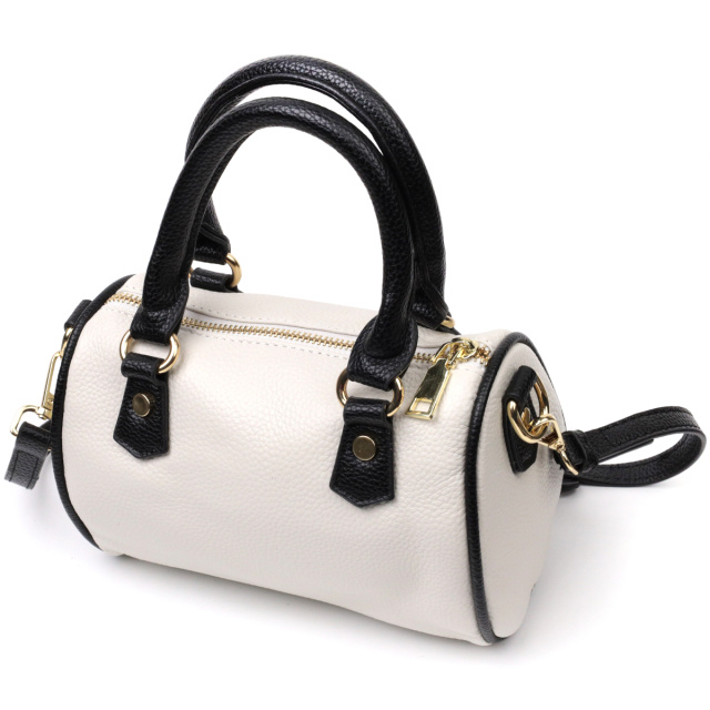 Модная женская сумка-боченок из натуральной кожи. Изделие представлено в сочетании двух цветов белого и черного.Аксессуар состоит из одного отделения в котором потайной карман на молнии. Носить сумку можно в руке, для этого предусмотрены кожаные ручки, а также на плече и через плечо, для этого имеется кожаный съемный ремень. В аксессуаре использована качественная фурнитура цвета желтого золота. Отличный вариант сумки для женщин, которые любят качественные и стильные вещи.