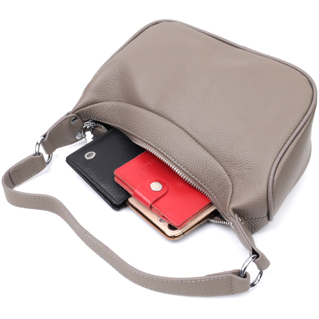 Практичная сумка из натуральной кожи с высоким показателем качества и износостойкости. Аксессуар состоит из одного отделения с потайным карманом на молнии внутри. Носить сумку можно в руке, на плече и через плечо, для этого имеется кожаный съемный ремень. В изделии использована качественная фурнитура цвета серебра. Отличная сумка которая придется по душе даже самым придирчивым модницам.