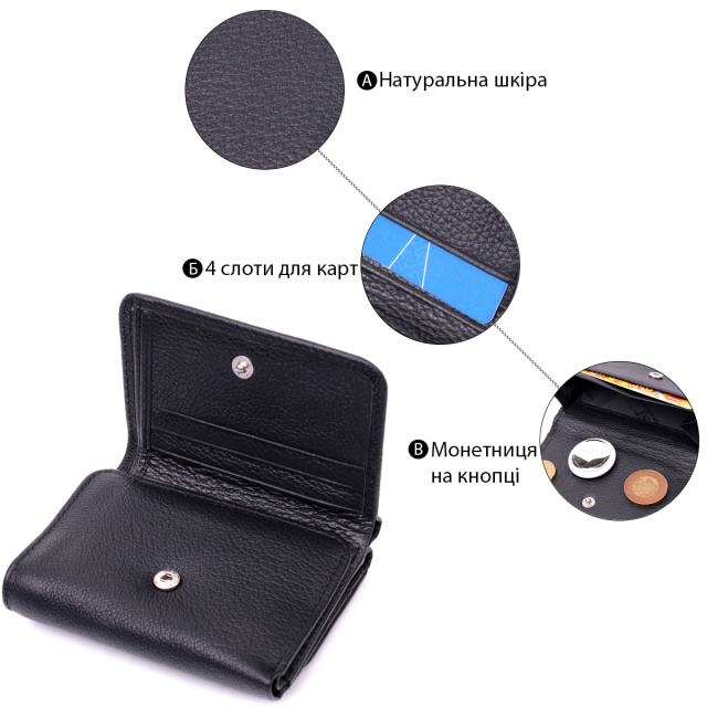- 1 наружный карман с отделением для кредитки, что закрывается клапаном на кнопку;