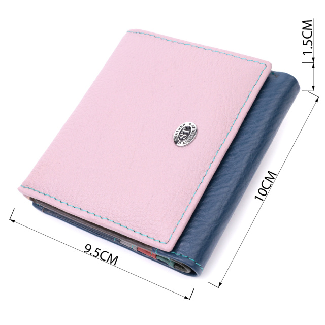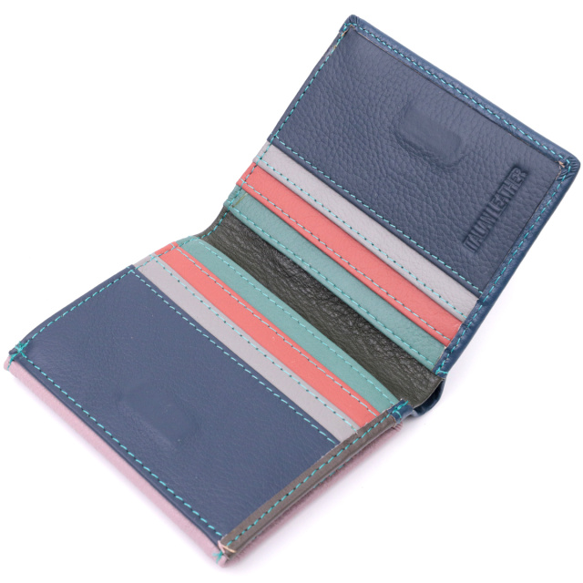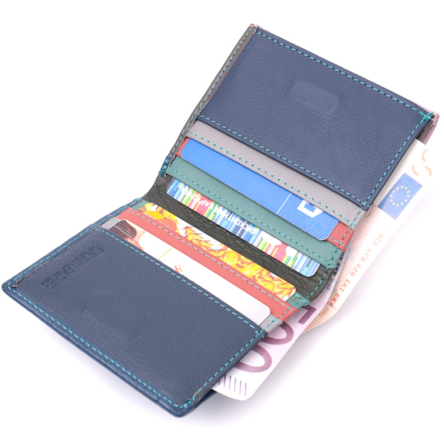 Оригинальный кошелек для женщин в два сложения из натуральной кожи высочайшего качества. Фишкой этого кошелька является его многоцветная гамма, такой аксессуар сразу бросается в глаза, состоит он из двух вместительных отделений для купюр, шести ячеек для карт, двух скрытых карманов и кармана для монет. Снаружи изделие прошито ровной строчкой бирюзового цвета по краю и украшено металлическим логотипом компании производителя. Портмоне дополнено надежной фурнитурой и крепкой подкладкой. Укомплектован кошелек в фирменную картонную коробку белого цвета.