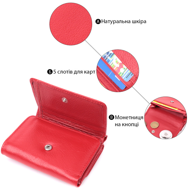 Отменная модель кошелька для женщин - компактная, тройного сложения, что закрывается на клапан с кнопкой. Аксессуар выполнен из качественной натуральной кожи, которая отлично носится и не теряет свой первоначальный вид с годами. Внутри есть два отделения для купюр, пять слотов для пластиковых карт, два скрытых кармана, прозрачное окошко для фото и одна монетница, что закрывается клапаном на кнопку. Кошелек упакован в белую коробку презентабельного вида, что делает его идеальным подарком.